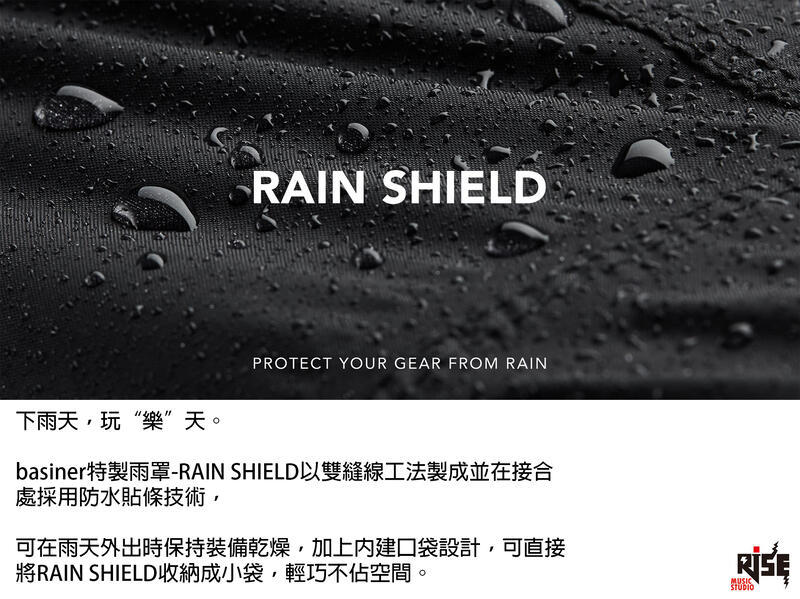basiner特製雨罩-RAIN SHIELD以雙縫線工法製成並在接合處採用防水貼條技術,可在雨天外出時保持裝備乾燥,加上內建口袋設計,可直接將RAIN SHIELD收納成小袋,輕巧不佔空間。