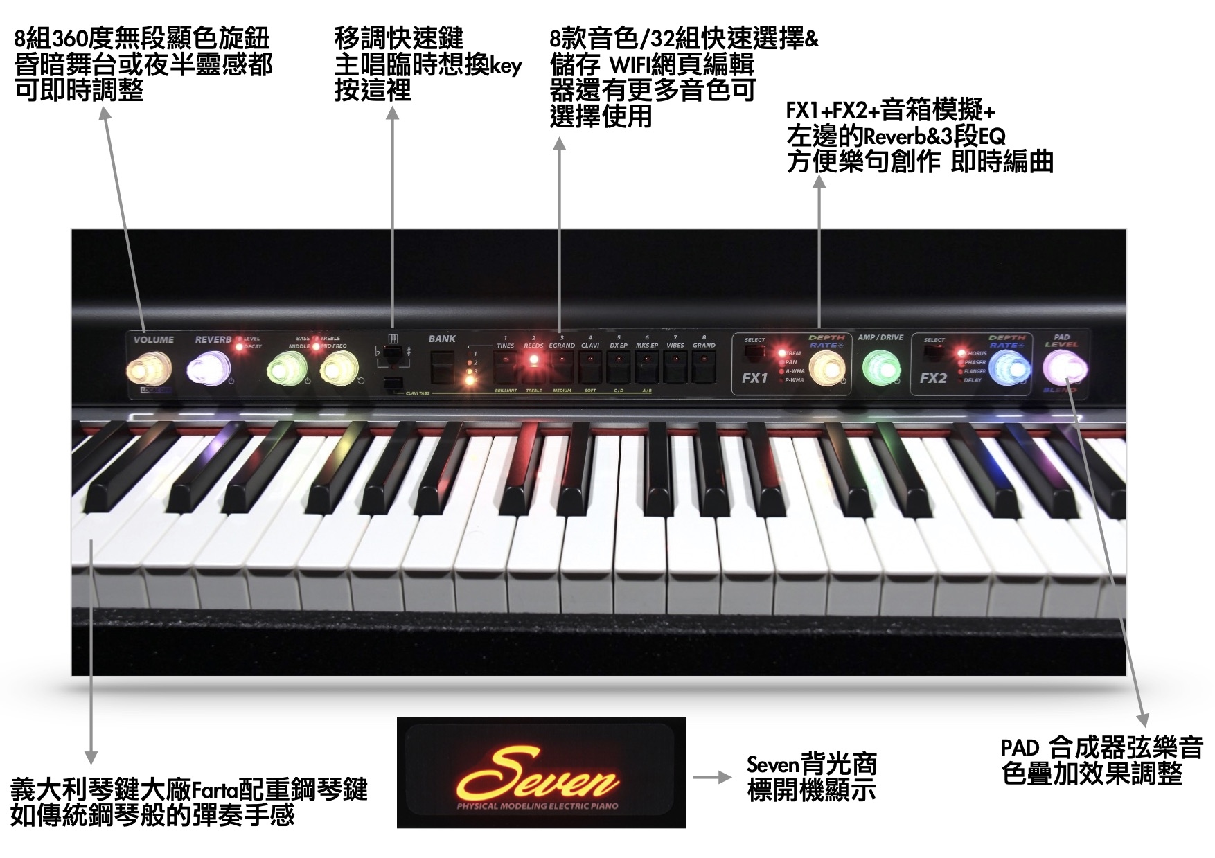 -3段效果音色 -PAD弦樂合成器音色疊加效果 -快速移調鈕,方便與人聲或其他樂器伴奏 -WIFI網頁編輯器登入,