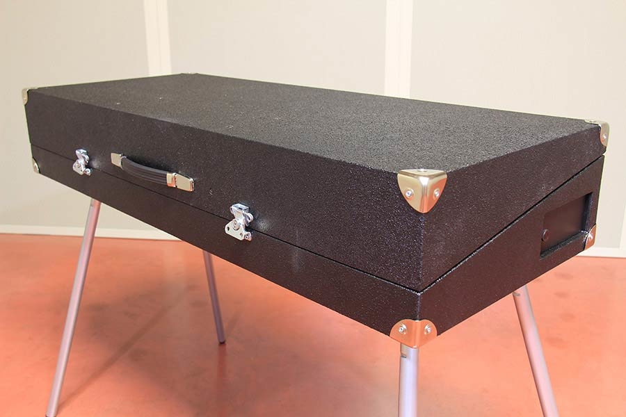 - built into a solid wooden case with handle