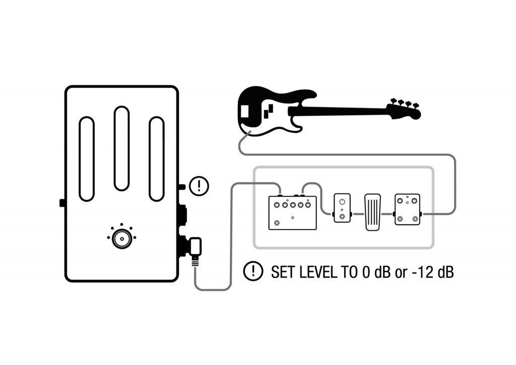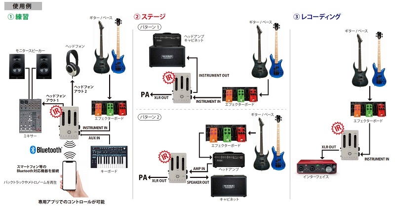 應用1: 放置於效果器盤signal chain的最尾端,輸入訊號到 “INSTRUMENT IN”,Elemen 輸出所選擇的 cab sim 音色(slot 1~5/bypass) 到XLR/耳機,此為基本的使用情境。