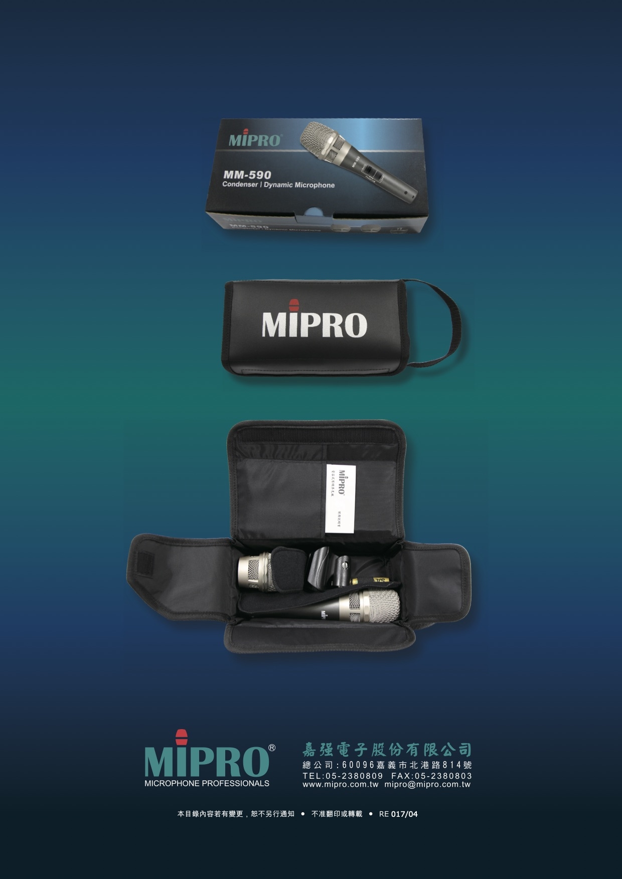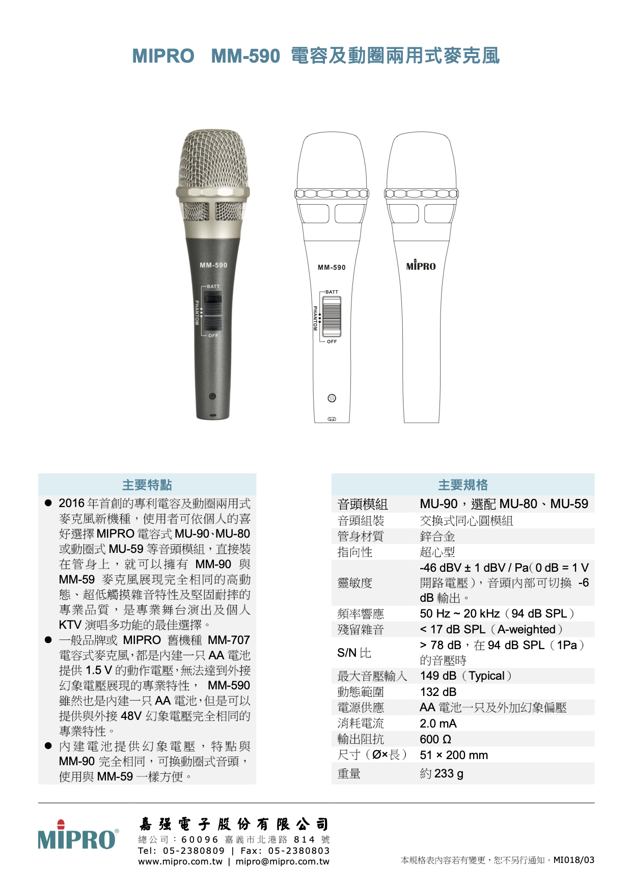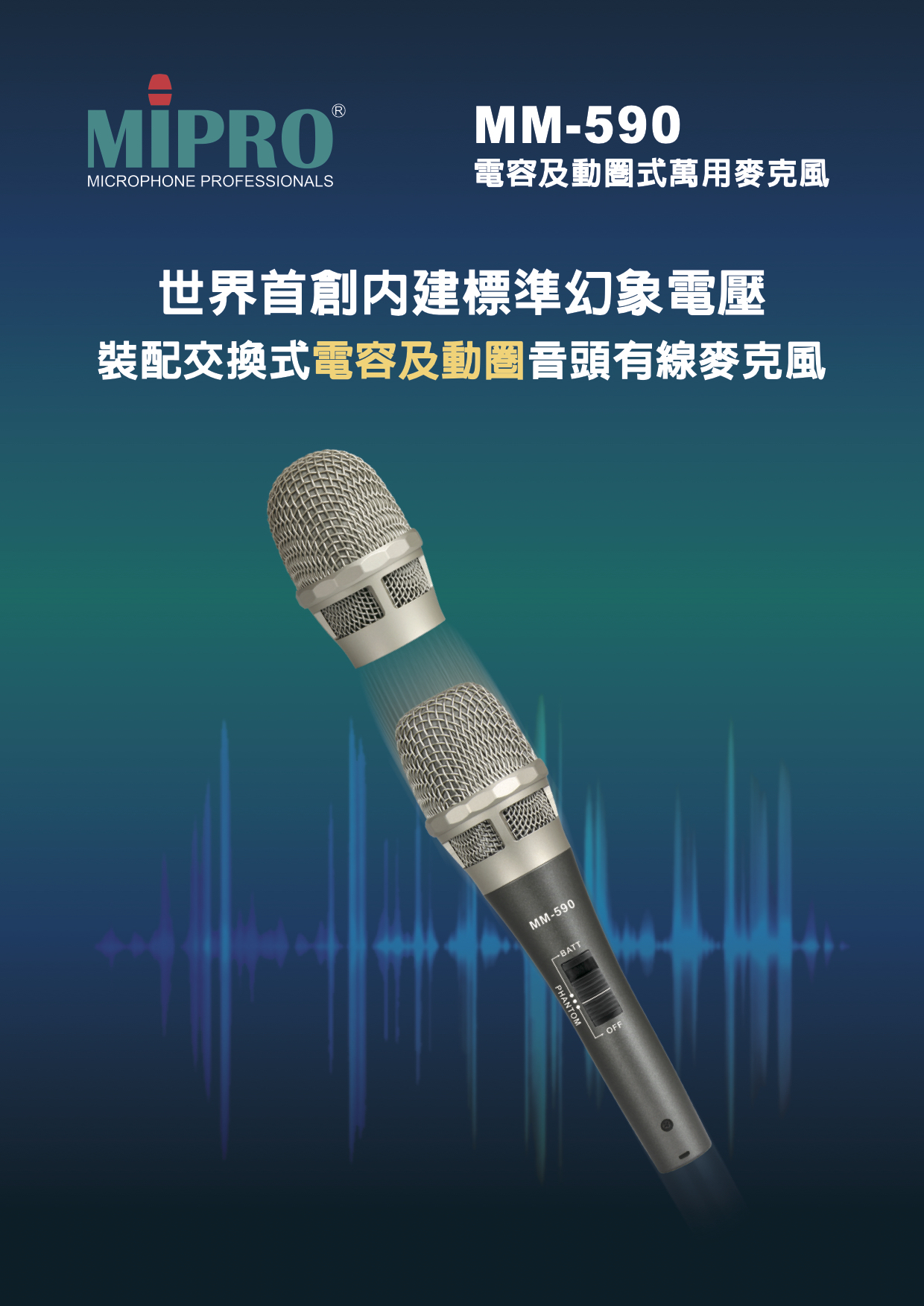 MM-590是2016年首創的專利電容及動圈兩用式麥克風新機種,使用者可依個人的喜好選擇MIPRO電容式MU-90、MU-80或動圈式MU-59等音頭模組,直接裝在管身上,就可以擁有MM-90與MM-59麥克風展現完全相同的高動態、超低觸摸雜音特性及堅固耐摔的專業品質,是專業舞台演出及個人KTV演唱多功能的最佳選擇。