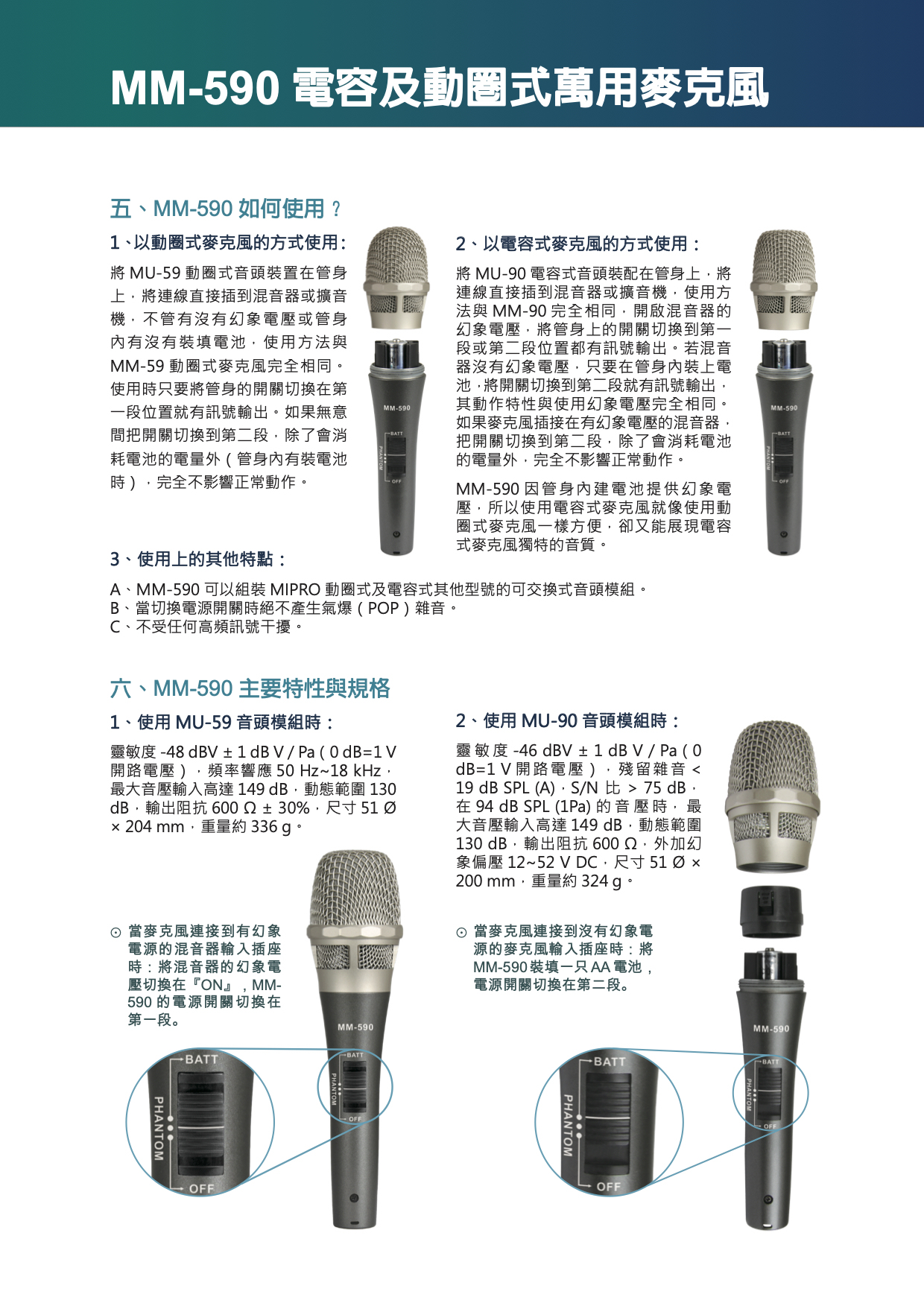 內建電池提供幻象電壓,特點與MM-90完全相同,可換動圈式音頭,使用與MM-59一樣方便。
