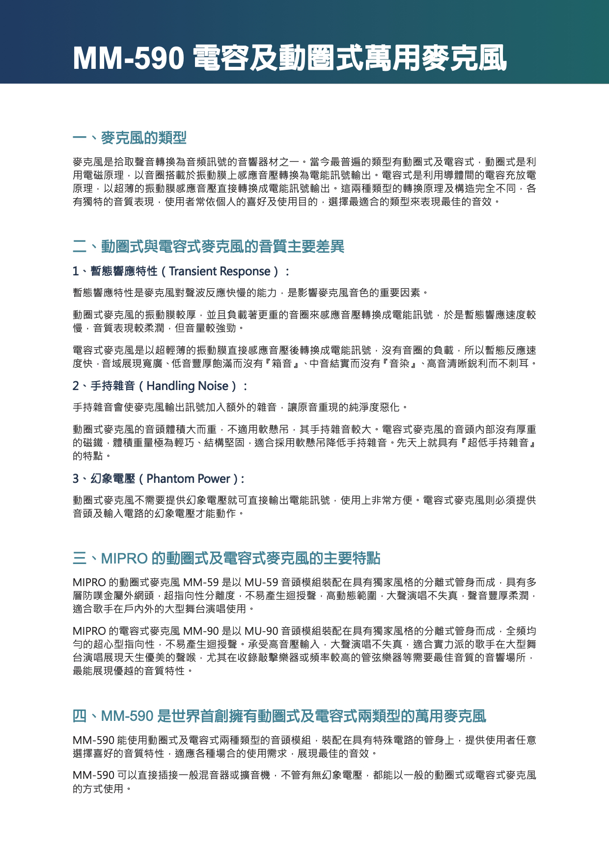 一般品牌或MIPRO舊機種MM-707電容式麥克風,都是內建一只AA電池提供1.5 V的動作電壓,無法達到外接幻象電壓展現的專業特性, MM-590雖然也是內建一只AA電池,但是可以提供與外接48V幻象電壓完全相同的專業特性。