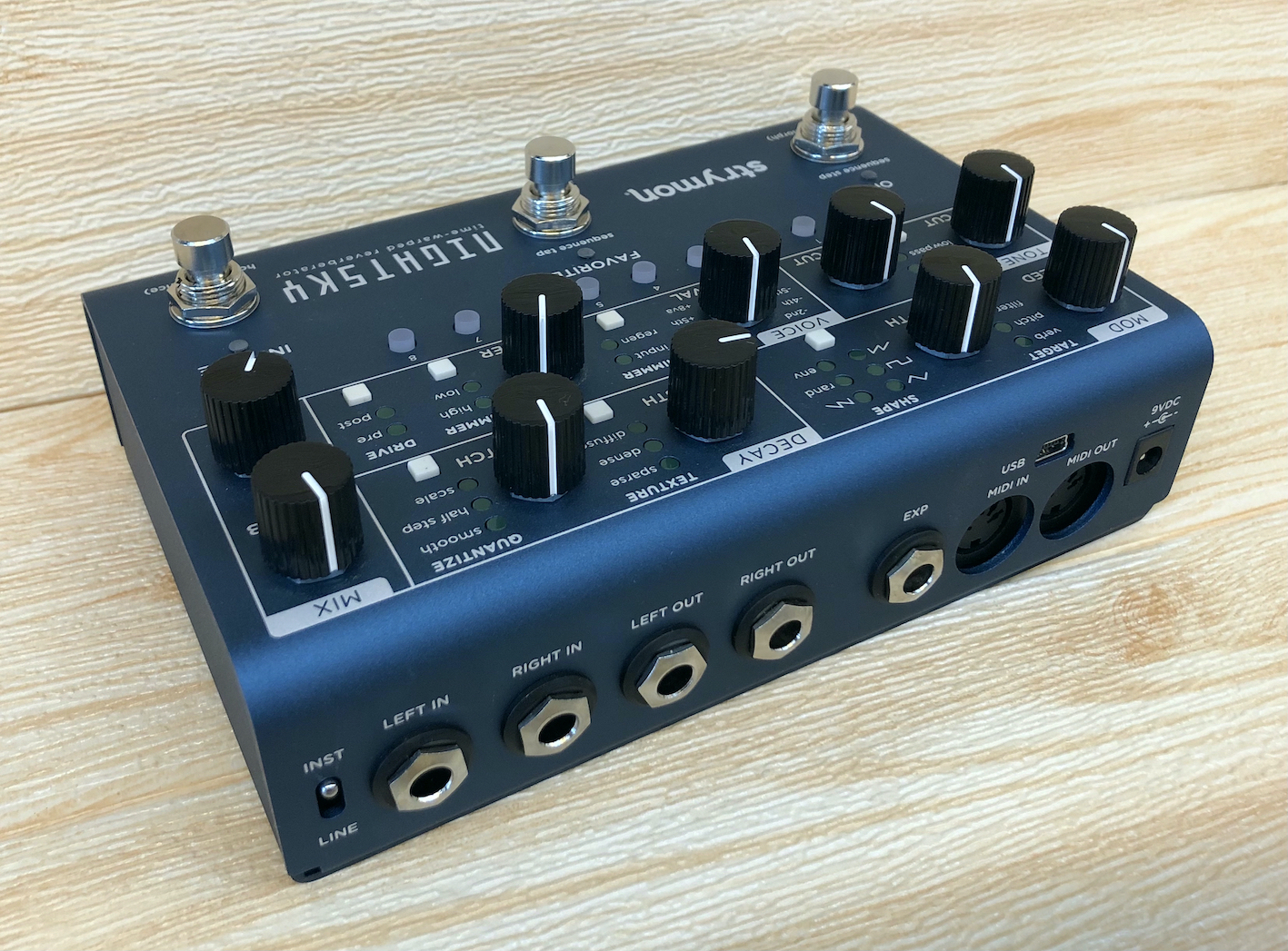 NightSky提供了一個輸入電平開關,可以與各種輸入源完美配合。使用吉他電平輸入時,將開關設置到INST位置。在吉他放大器的效果循環中使用NightSky時,或使用合成器或混音器插入的熱輸出驅動NightSky時,請設置為 輸入模式為您提供了10dB的淨淨裕量,非常適合將NightSky用作錄音室中的發送效果或插入效果。